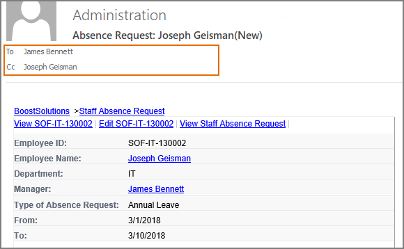 Then, the users James Bennett (the To… recipient), Joseph Geisman (the CC… recipient), and Cynthia Carey (the BCC… recipient) will receive a notification email as following.
