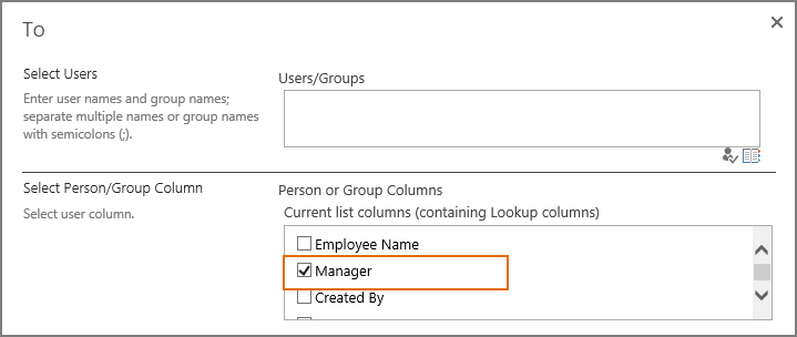 Here we specify the Manager column (Person or Group) as the recipient, which means that the users or groups represented in the Manager column will receive the notification email.