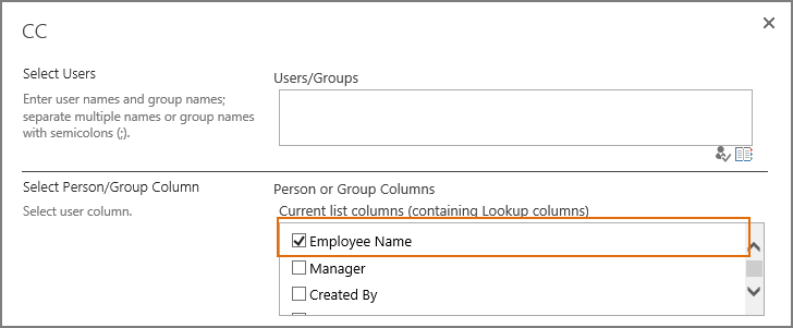 When CC dialog appears, select Employee Name column in Select Person/Group Column section. which means that users represented in Employee Name column will receive a carbon copy email.