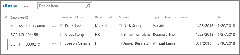 Now, let’s create a new item in Staff Absence Request list as following.