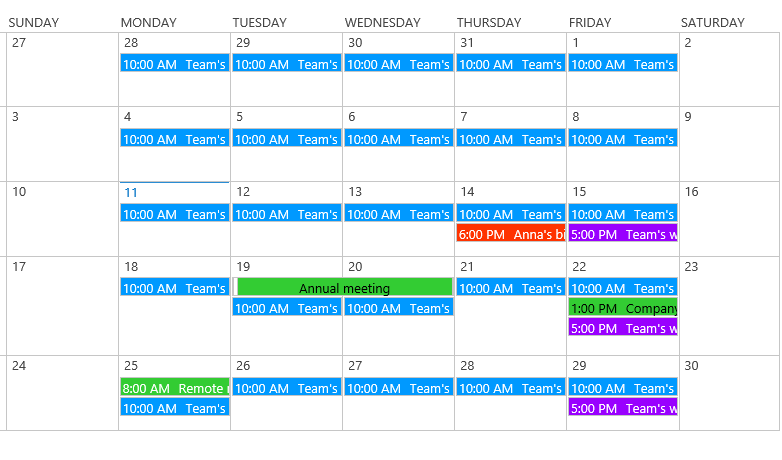 Color-coding calendar events based on different calendar sources, event types or specific conditions to make it easy to identify and categorize information, better to track your meetings and schedules.