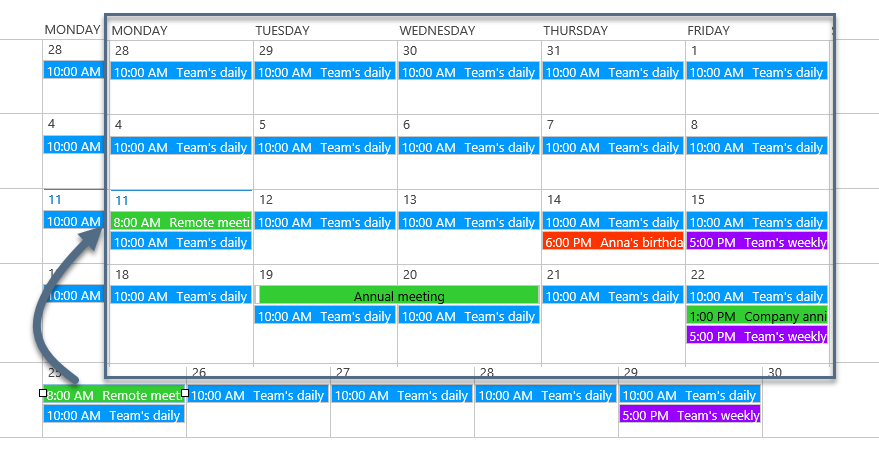 To rearrange the date of an event, simply drag and drop it. To change the events timeframe, just stretch the event to incorporate the correct time duration for the event. Changes can be automatically synced to the data sources.