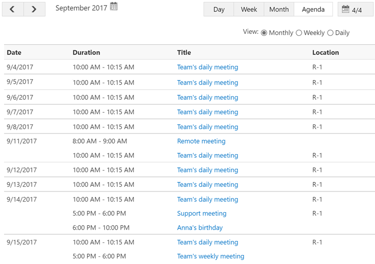 Calendar Rollup provides several basic calendar views. You can view your calendar events in Day, Week, Month or Agenda view.