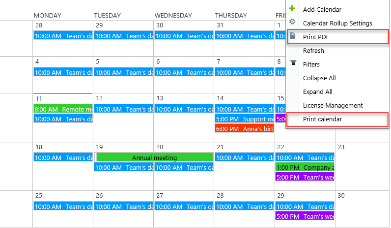 Users can quickly and easily print any calendar view (Day, Week, Month, Agenda View, filtered view) or save the calendar view as a PDF file so that they can conveniently check events anytime, anywhere.