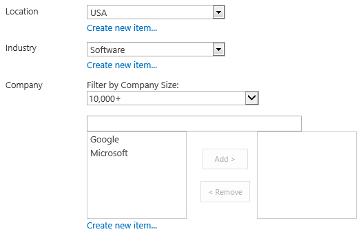 c. The lookup items in the Company column will be filtered by Location (USA), Industry (IT Services), and Company Size (10,000+) columns in the source lookup list, returning the filtered Companies.