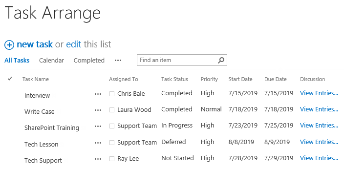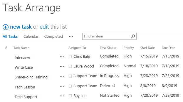 A list Task Arrangement is as following and each task is assigned to a member of the support team.