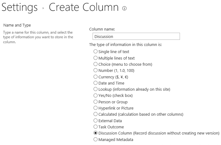 b. On the Create Column page, choose Discussion Column, and enter the name (such as Discussion), and then click OK.