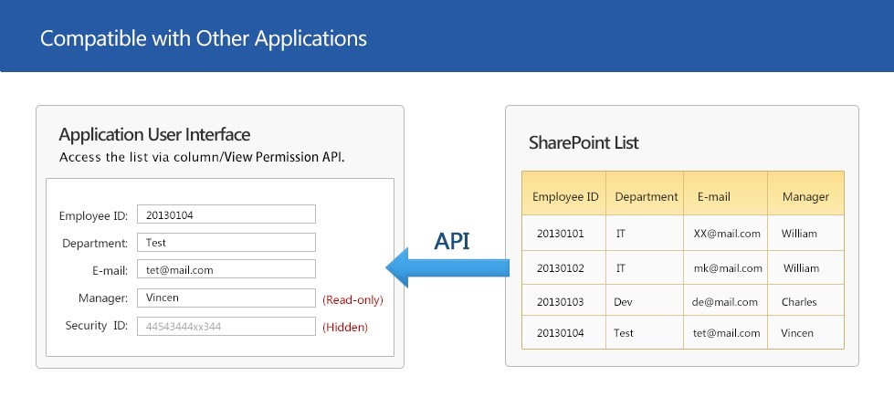 With the published API (Application Programming Interface) in column permission, you can integrate your app with column permission. This will control column access using column permission features, and prevent exposing sensitive data when users connect SharePoint data via the application.