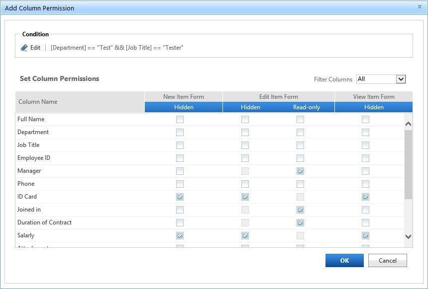 With conditions, you can determine whether and when columns should be visible, read-only or hidden, or which columns should be accessed by whom. This is very useful when your organization stores sensitive content alongside non-sensitive content.