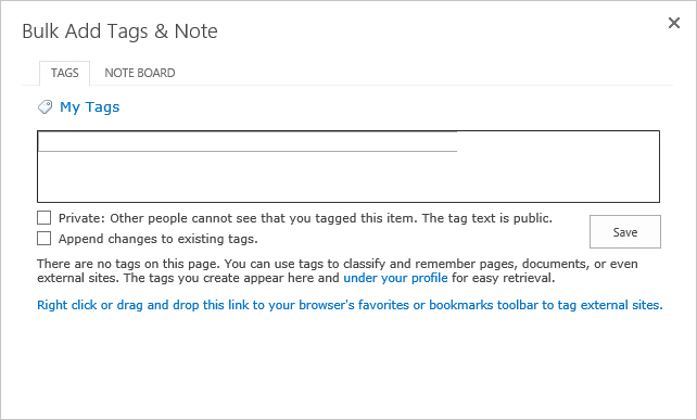 Bulk add tags and notes to documents or list items, without the pain of tagging them individually. You can then, with less effort, help people easily find and share relevant information and resources.