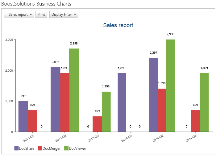 SharePoint Business Charts provides a quick and easy way to create a chart or graph in SharePoint list. Using the step-by-step wizard, users can configure grouping, aggregate and filter functions to create the desired chart. Even better, the data or chart can be exported to Microsoft Excel or printed for offline use.