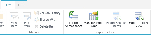 b. On the Ribbon, click the Items tab, and then click Import Spreadsheet in the Import & Export group.