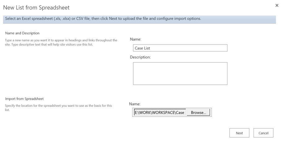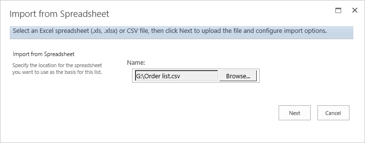 d. In the New List from Spreadsheet dialog box, choose an Excel spreadsheet or CSV file.