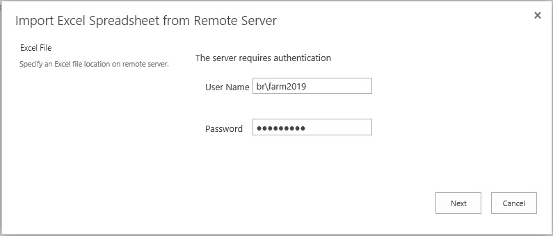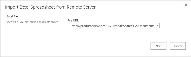 d. The Import Excel Spreadsheet from Remote Server dialog box will open. In this dialog box, enter the File URL.