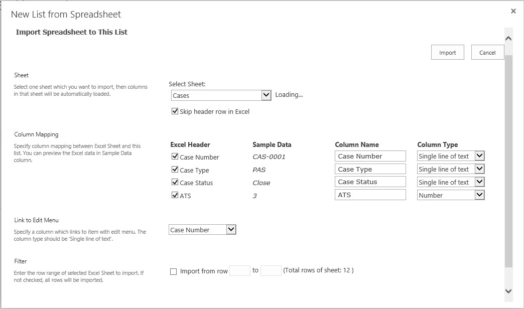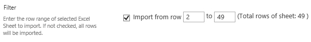 In the Filter section, specify the row range of the selected Excel sheet to import to list.