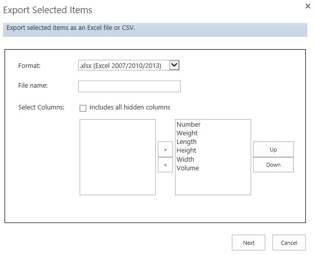 d. By default, all columns in the current view will be selected for export. You can also choose the columns that you want to export and change the columns position by clicking Up or Down button.