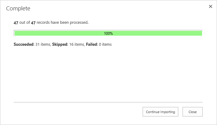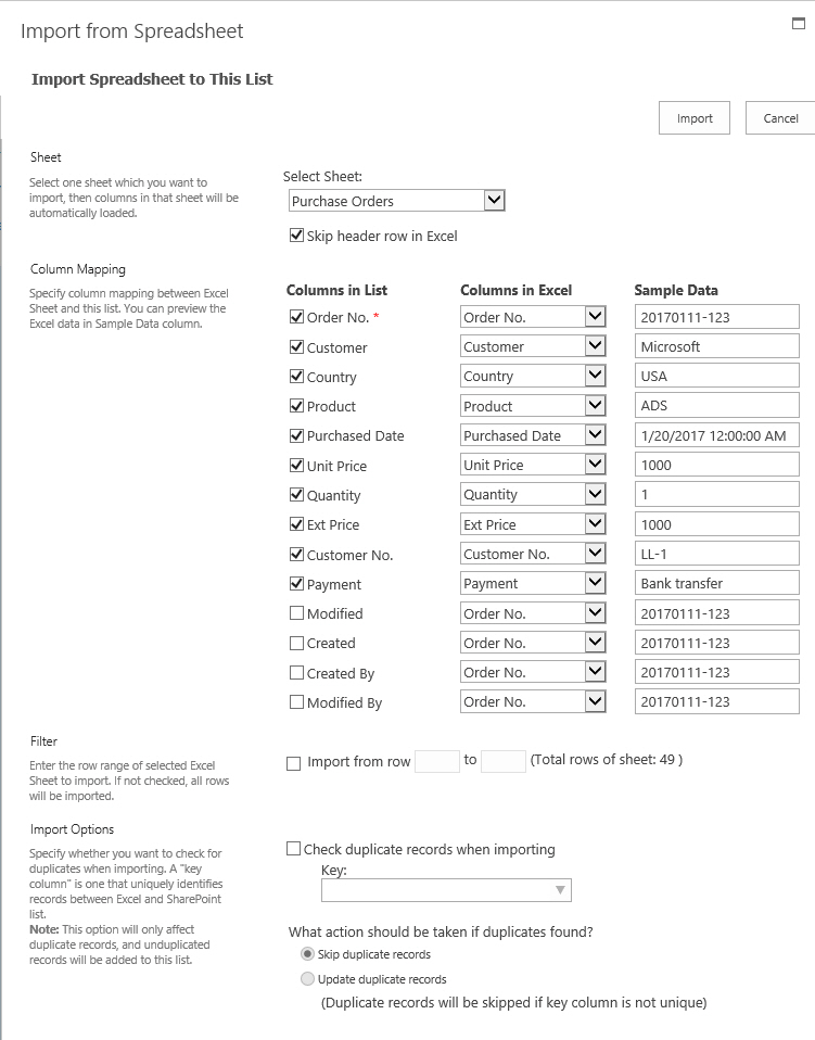 Duplicate records will be filtered and then updated first. Secondly, Excel Import will replace information found in the duplicate records in SharePoint using the corresponding information from the Excel spreadsheet. Finally, the remaining data will be regarded as new records and imported accordingly.