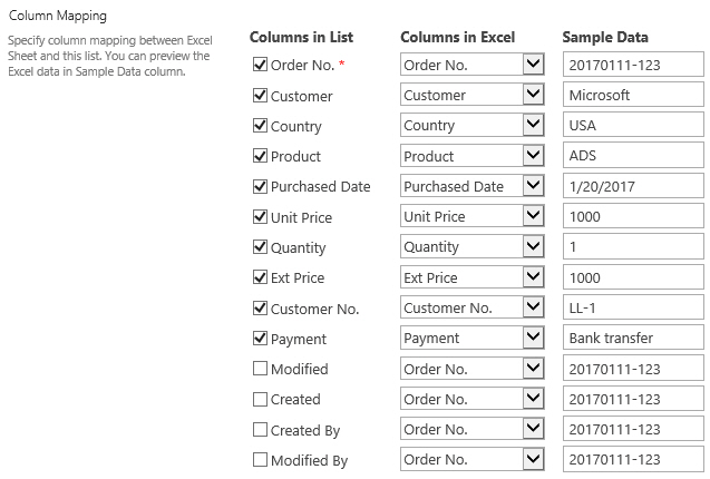 When you toggle between different Excel columns, the value in the Sample Data field will change correspondingly. Thus you don’t need to switch back and forth between the Excel file and SharePoint. This ensures that you insert the right information into the right place.