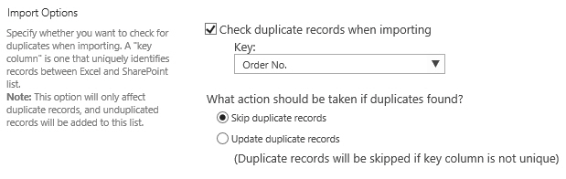 Once the Check duplicate records when importing option is enabled, there are two actions that can be taken if any duplicates are found when importing Excel to SharePoint.